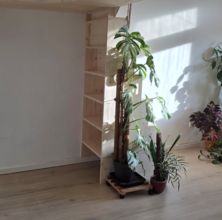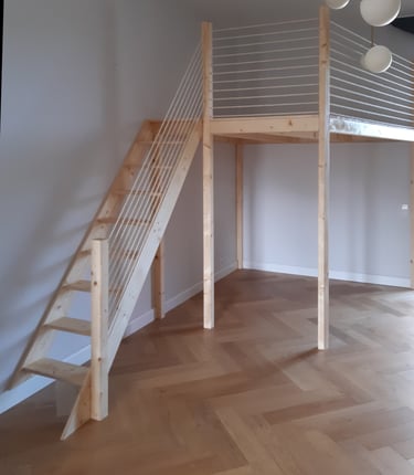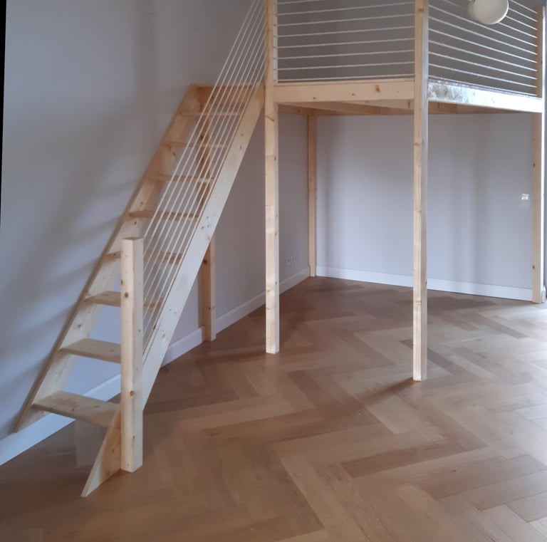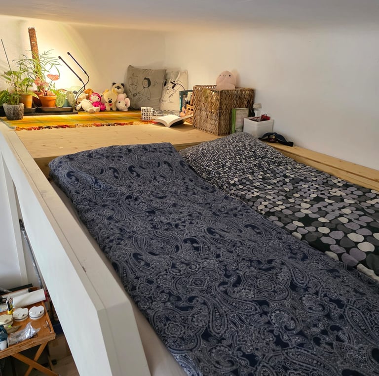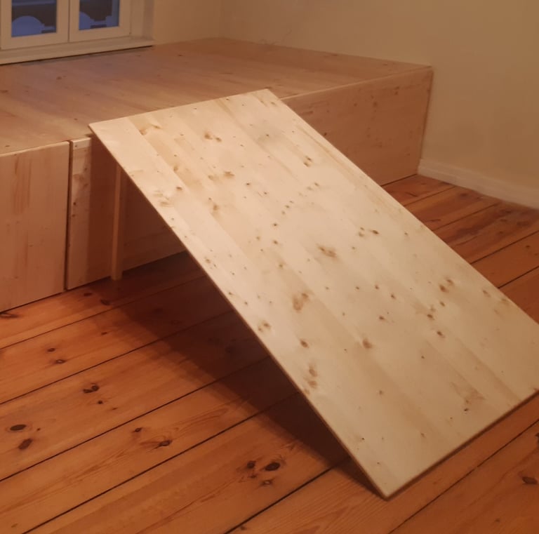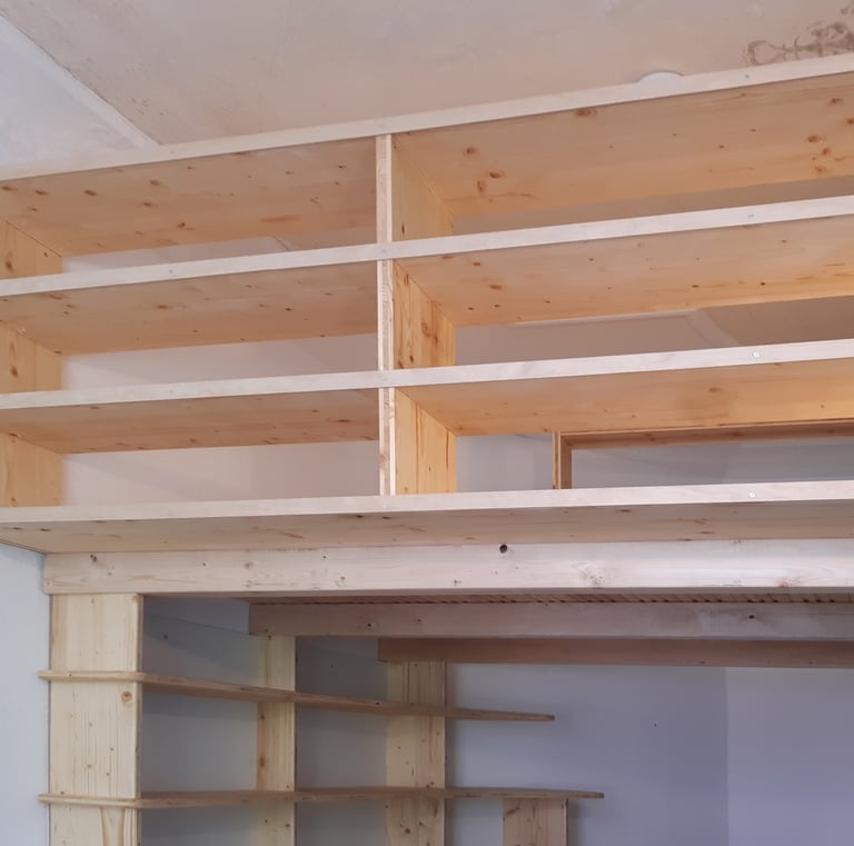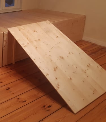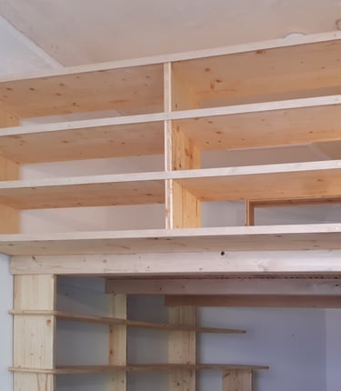 In einem besonders schmalen Kinderzimmer habe ich für ein 10-jähriges Mädchen eine passgenaue Hochebene geplant und gebaut, die nicht nur zum Schlafen, sondern auch zum Spielen, Lernen und Verstauen dient.