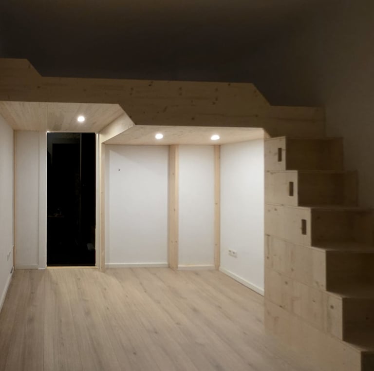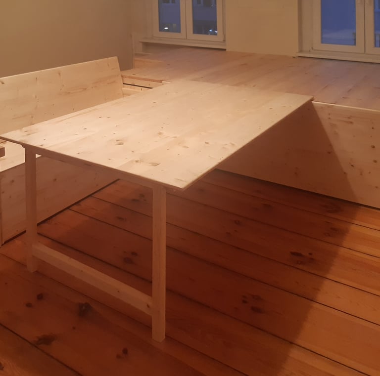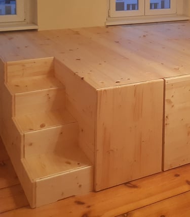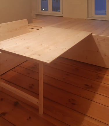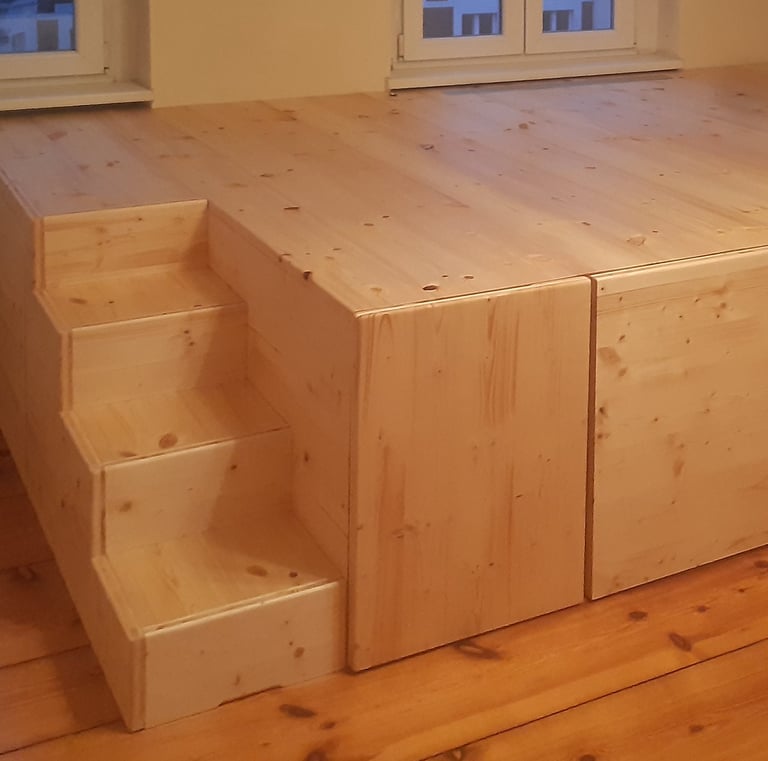 Dieses individuell gefertigte Podest wurde für ein (noch) ungeborenes Kind entworfen – mit dem Anspruch, Raum zu schaffen, der das Familienleben ins Zentrum stellt. Ein Möbelstück, das Spiel, Ruhe und Stauraum intelligent vereint.